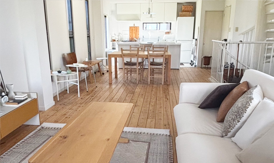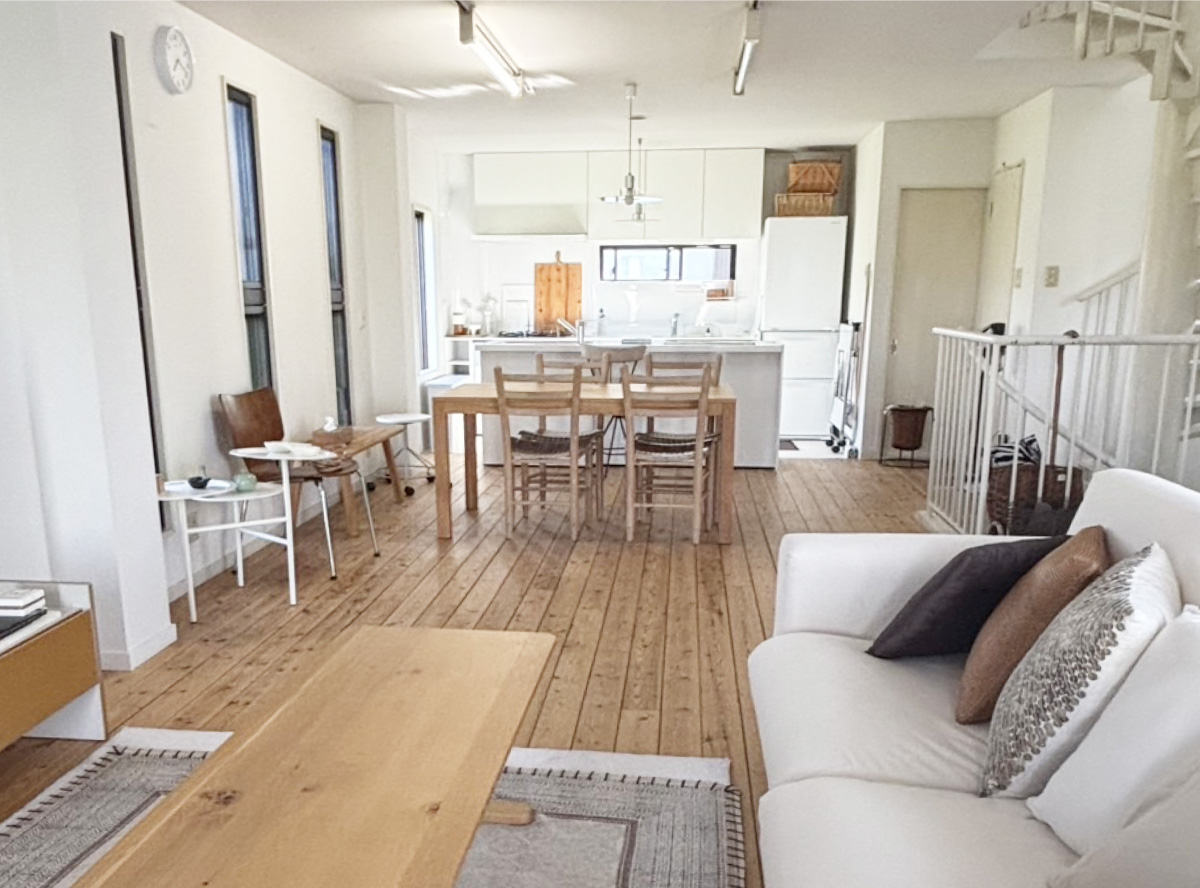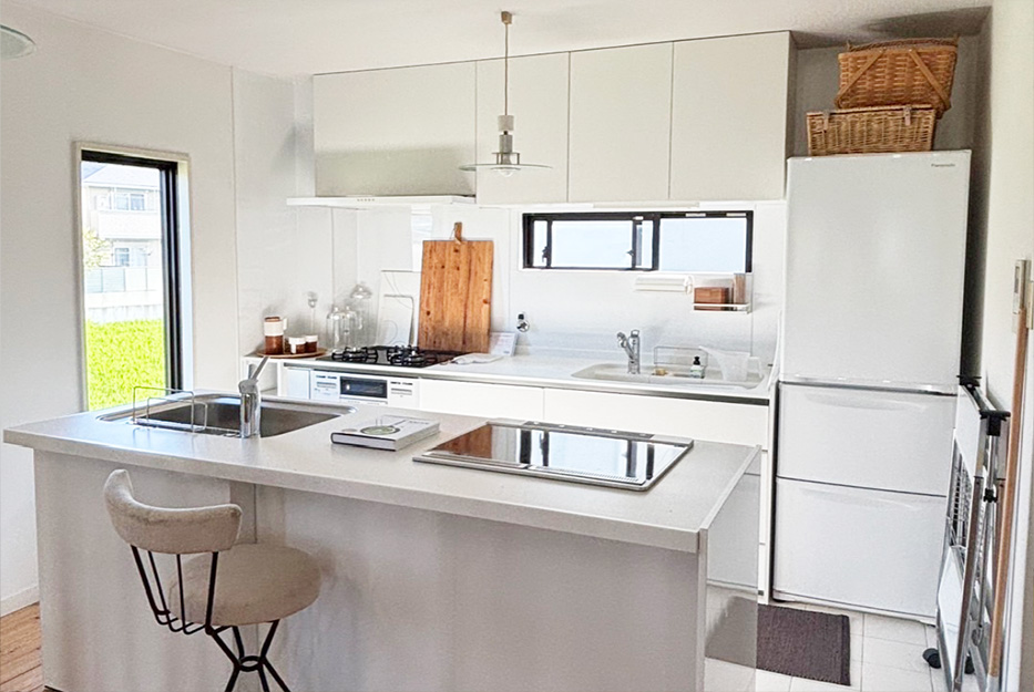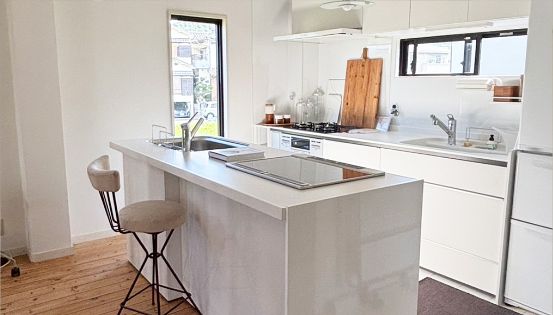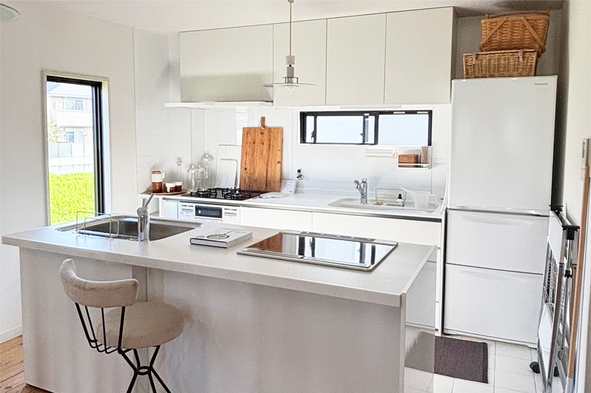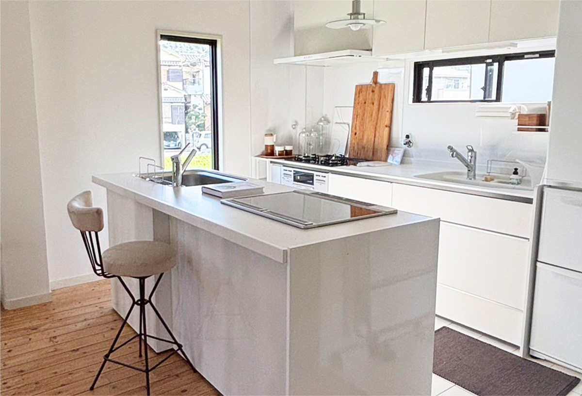 白のキッチンカウンターは、現在移動式のシステムキッチンに変更になっています。