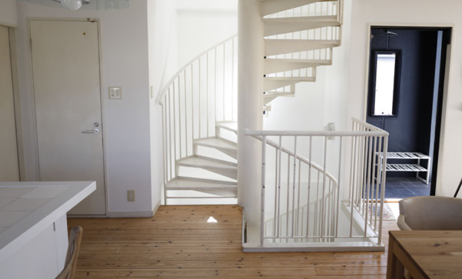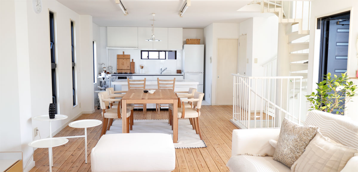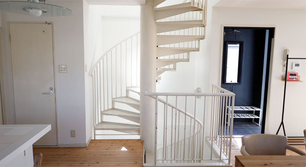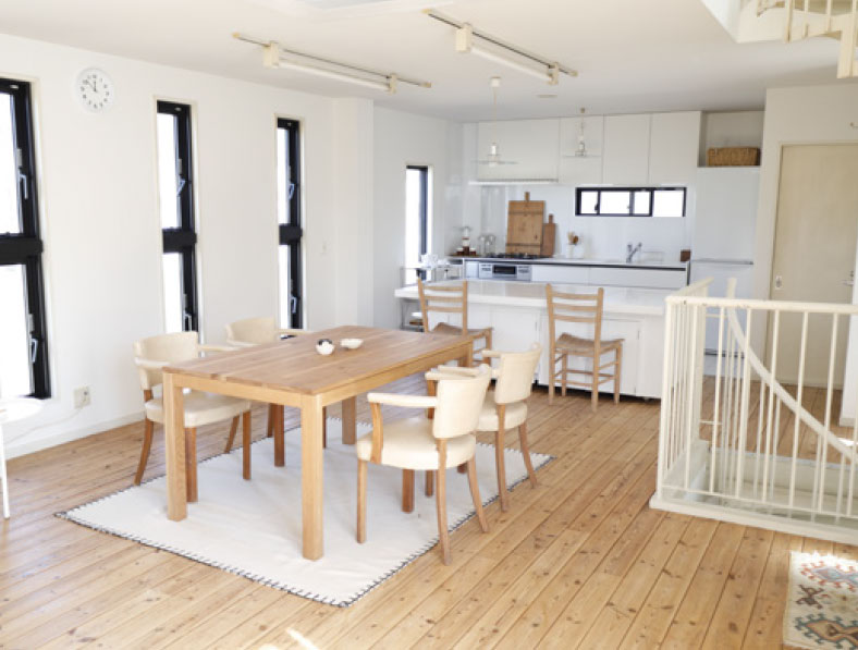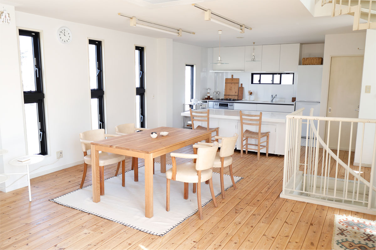 白のキッチンカウンターは、現在移動式のシステムキッチンに変更になっています。
