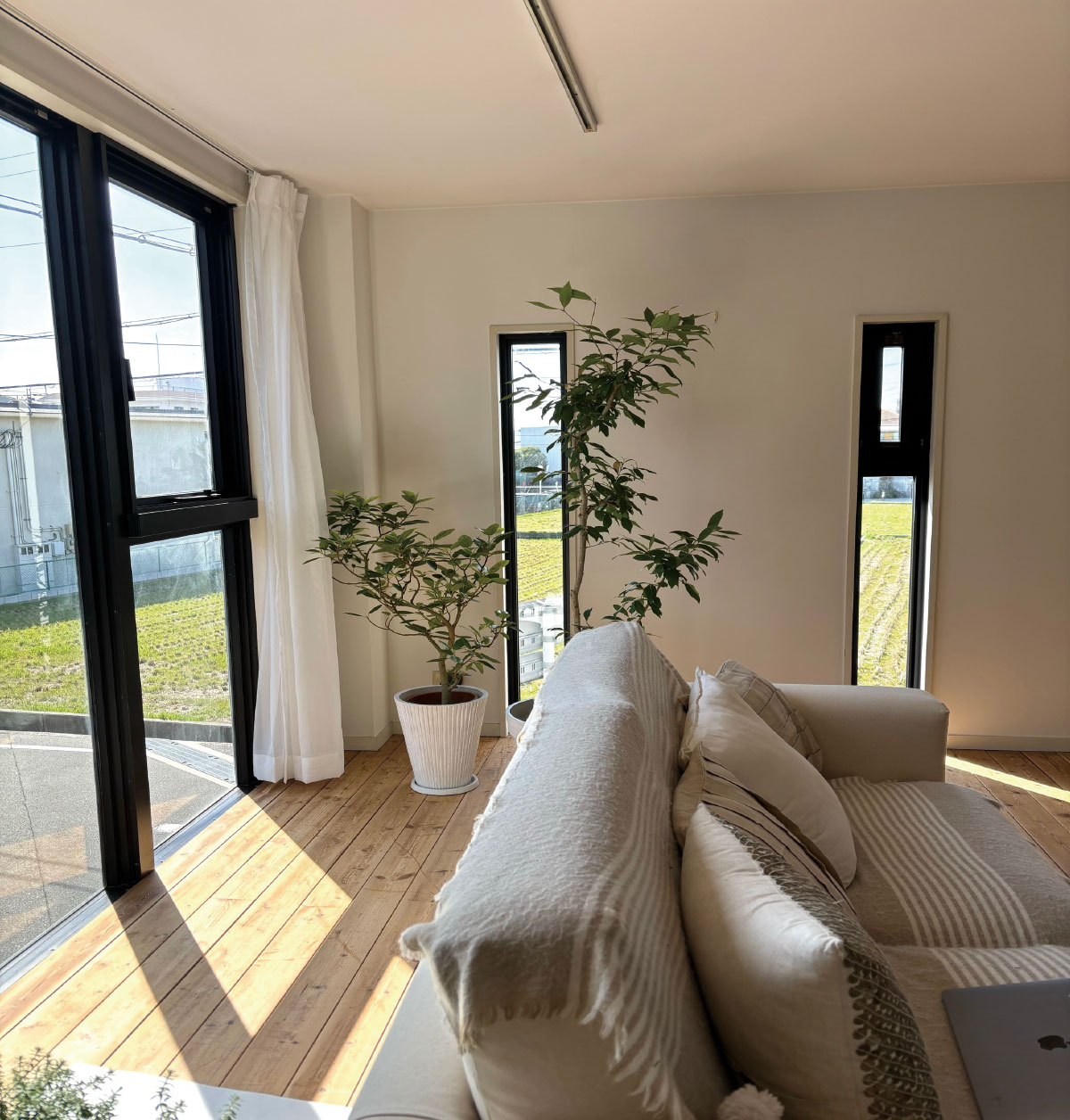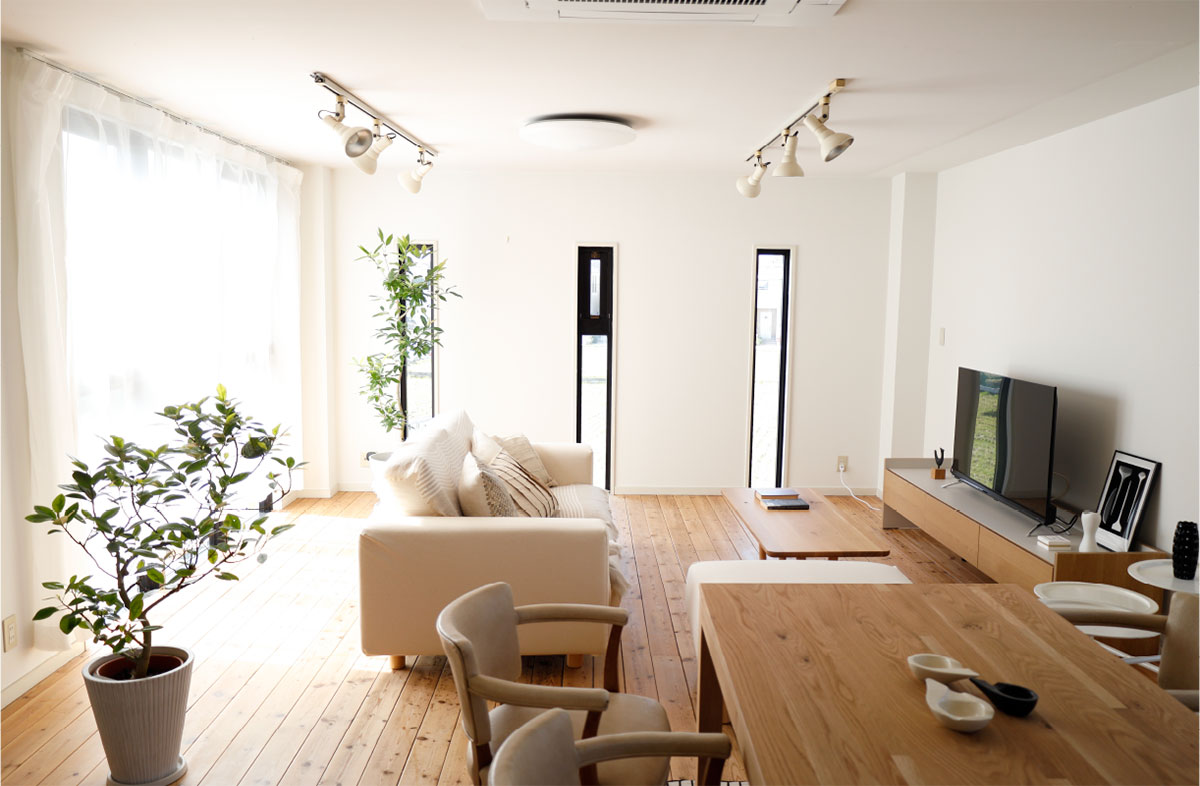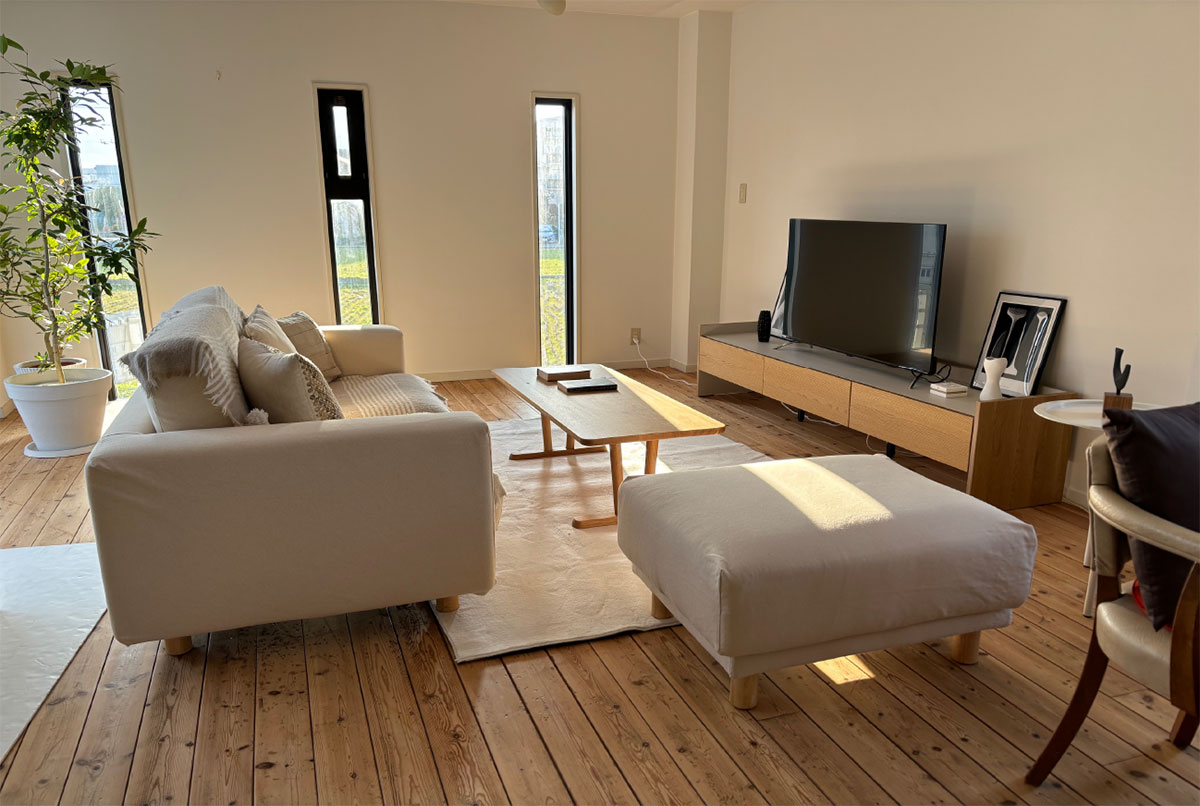 白のキッチンカウンターは、現在移動式のシステムキッチンに変更になっています。